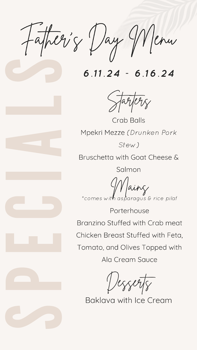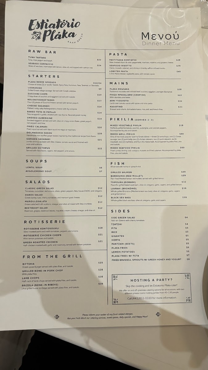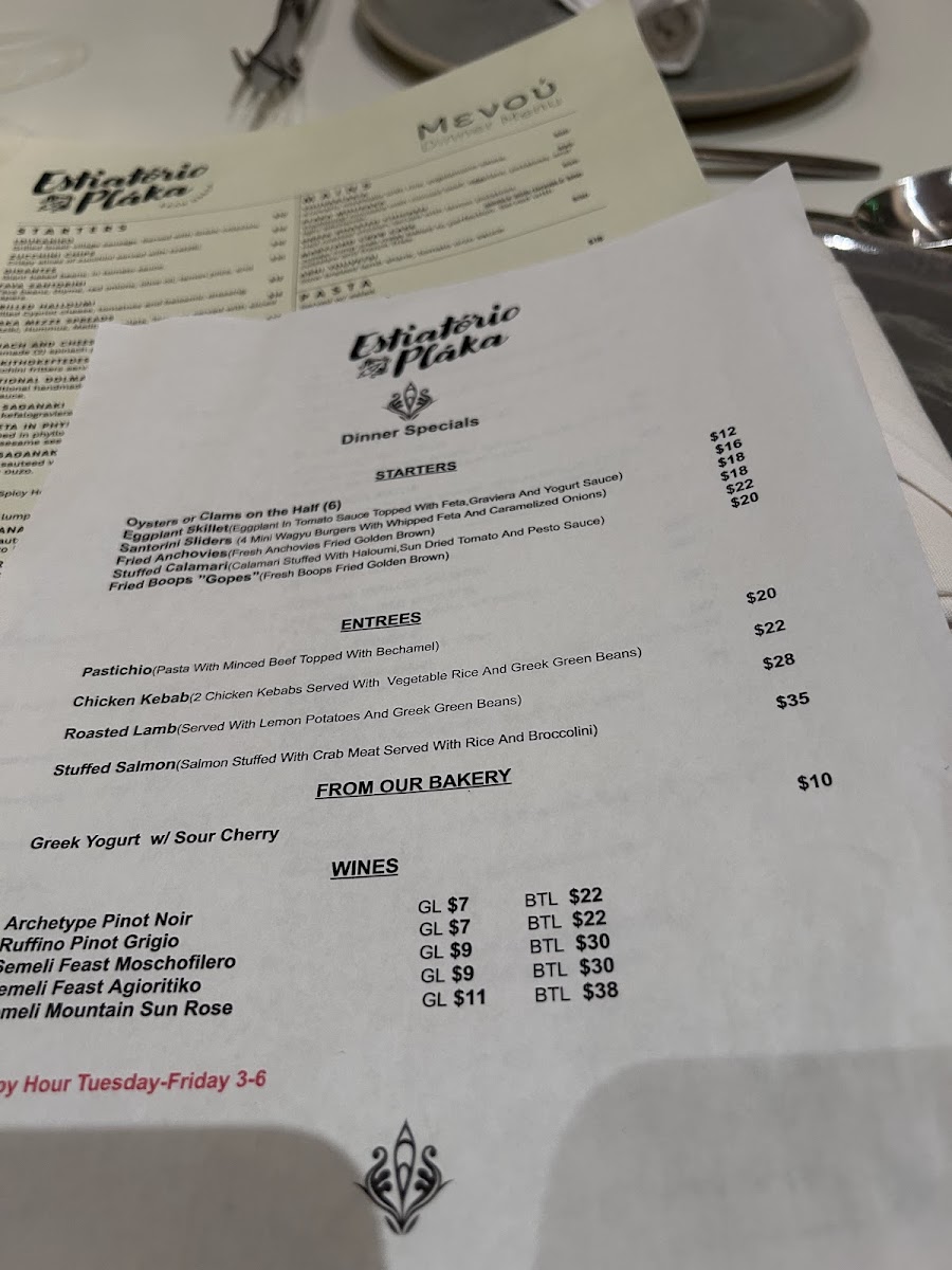 Includes, homemade Humus, tzatziki, eggplant, Fava spreads served with pita bread.